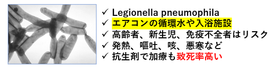 レジオネラは細菌で、”水”と関連する場所に増殖します。空調に使われる循環水や、入浴施設で見つかることがあり、エアロゾル感染を起こします。