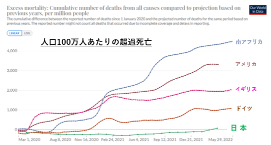 100万人当たりの超過死亡ですが、日本は一番下の緑です。最後にちょっとだけ0を超えたレベルで、それ以前はずっとマイナスです。