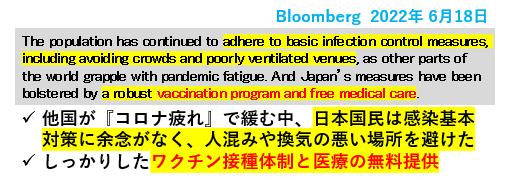 最近、日本のコロナ対策を讃える記事が出てきております。最近ではウォールストリートジャーナルの記事*3もありましたし、今回扱うブルームバーグの記事*4もそうです。