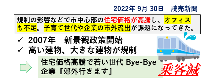 すると、マンションやショッピングモールや高いビルは作れません。企業は郊外へ移転します。さらに、住宅価格高騰し、若い世代が出ていく・・・