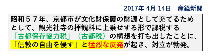 そうなると観光地・京都のイメージダウンで観光客減ります。結局、寺社らの粘り勝ちで古都税は3年で終わりました。