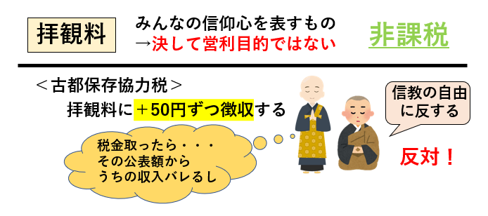 1985年から京都では古都保存協力税というものが実施されました。要は市内にある40の寺社への拝観料に併せて50円ずつ徴収するというものです。