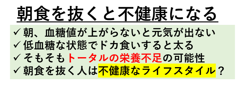 しかし、それは、そもそも朝食を取る人は『健康志向が強い人』が多いからだろうとしています。つまり、逆を言えば、朝食を取らない人は普段の昼食も夕食もあまり健康に気遣っていない人が多いだろうということですね。