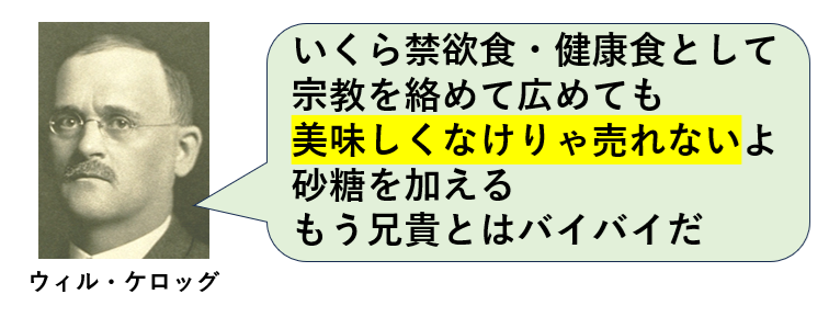 砂糖を加えると性欲が高まるので、ジョン・ケロッグは拒否していましたが、弟のウィルは、「美味しくないと売れない!」と方向性の違いから決裂しました。
