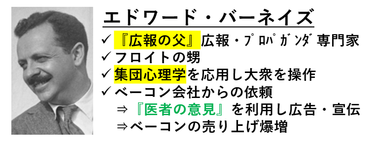 しかし、ここに心理学・PR・プロパガンダの専門家エドワード・バーネイズという男が現れます。