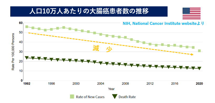 いえ、実は大腸癌は年々減っている*1のです。(注:アメリカでは!!)