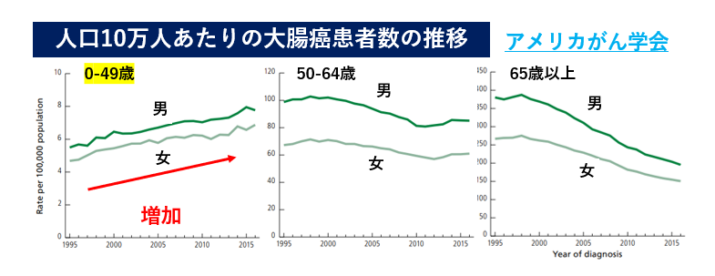 アメリカがん学会の報告*2によると、高齢者では大腸癌は減少してきているものの、一方で50歳未満の若年性大腸癌はこの20-30年間で1.5倍以上に増えているのです。
