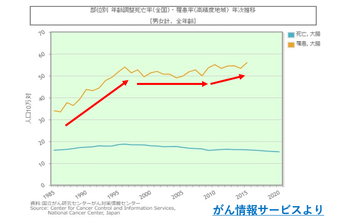豊かになった現代、大腸癌はさぞかし増えているのでしょう・・・