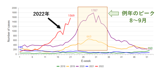 これを見ると、2018年と2021年は大きな流行はなかったのですが、大体8~9月にピークを迎えていることがわかります。一方で、2022年の赤い線はかなり早い段階で急増を迎えているわけです。