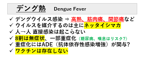 そもそも、デング熱というのは、インフルエンザや新型コロナのように人から移される感染症ではなく、蚊に刺されて感染します。熱帯地域に多い感染症です。