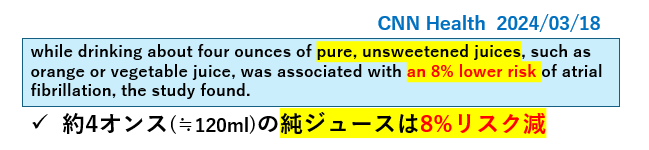 1日に120mlほど(?)の、砂糖の加えられていない純・ジュースを飲む人は心房細動のリスクが8%低くなるそうな。