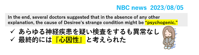 最終的に医者らの総合判断はストレスなどによる『心因性』である可能性でした。そして精神科を受診するように勧められたのです。
