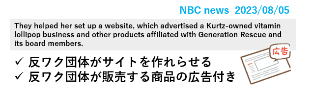 すると、彼らは「あなたの貴重な体験を人々に伝えて」とウェブサイトを作らせました。そのサイトには広告が出るようになっていますが、その内容はその反ワク団体が販売している食品や商品ばかりが流れます。