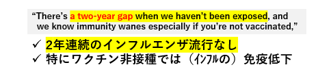 2020年・2021年とインフルエンザに曝露していない為、多くの人がインフルエンザに対する免疫が弱まっており、今回大流行となれば、死者が増えるということです。さらに、コロナも流行しており医療崩壊となる恐れがあります。