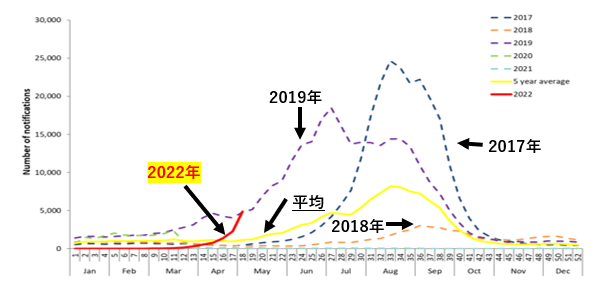 豪州でのインフルエンザのピークは通常8月なのですが、今年は1-2ヶ月早そうです。