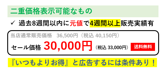ちなみに、セールでポイント還元でなく、『半額セール』などの場合は、直前4週間使われていた額から半額でないといけません。これは消費者庁が定めた二重価格表示のルール*3で規制されれています。