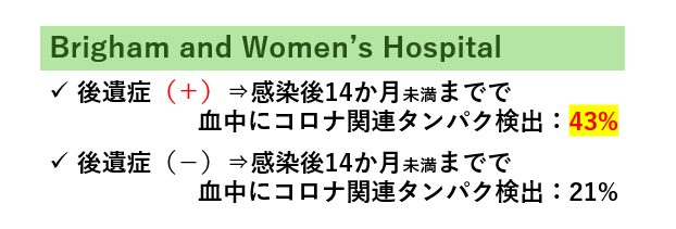 ということは、長期後遺症を訴える患者でも半分以上(57%)の人は、感染後1か月以降ではコロナ関連タンパクは検出されていなかったのです。
