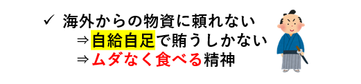 まず誰もが思いつくのは、食料・材料などが輸入できないので、全て国内であるもので賄う必要があります。