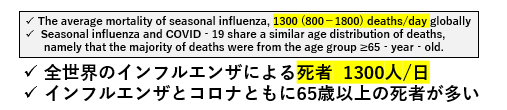 インフルエンザにより、全世界で毎日、平均 1300人の命が失われているそうで、この数字を指標にします。また、インフルエンザの致死率はアメリカのデータを用いて0.12%を指標とします。