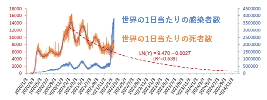 (全世界での)致死率を指標にするならば、2022年いっぱいでインフルエンザ並みとなり、『終息』といえる。ただし、2023年までは、死者数はインフルエンザの2~3倍出ることになりそうです。