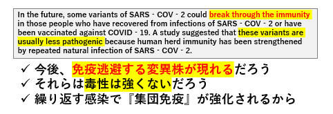 感染や接種による免疫をかいくぐる変異種が登場するだろうと。しかし、繰り返される感染などで人々の『集団免疫』はその度に強化されるため、往々にしてそれらの毒性は強くないとされます。