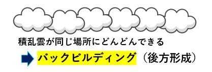 このように積乱雲が同じ場所にどんどん形成され、後ろに連なっていくことをバックビルディング(後方形成)と呼びます。