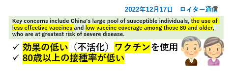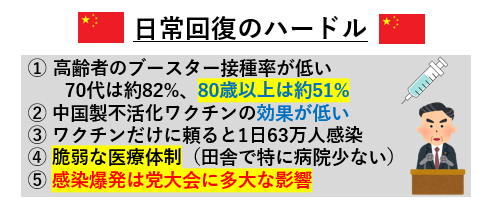 まず、中国が使用しているワクチンが、中国製の不活化ワクチンでどうやらそのワクチンの効果がかなり低いことです。そして、重要なのが一番ワクチンを打つべき高齢者の追加接種が進んでいないことと、農村部などの医療体制が非常に脆弱という事実があります。