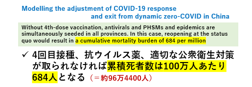 香港大学の元病院長を務めた梁卓偉氏らがまとめた報告書*4によると、ゼロコロナ政策終了後、ブースター接種などの大規模な措置を講じなければ、来年1年間で最大100万人の死者が出るとされます。